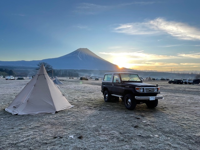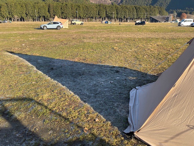 この日は、明け方に-3℃まで下がりました。ふもとっぱらは標高も高く、風も強い時もあるそうなので防寒、防風対策は十分な準備が必要だと思います。上の写真は、日の出のあとテントの影だけが霜が解け残っていました。もちろん車のフロントガラスも凍ていました。